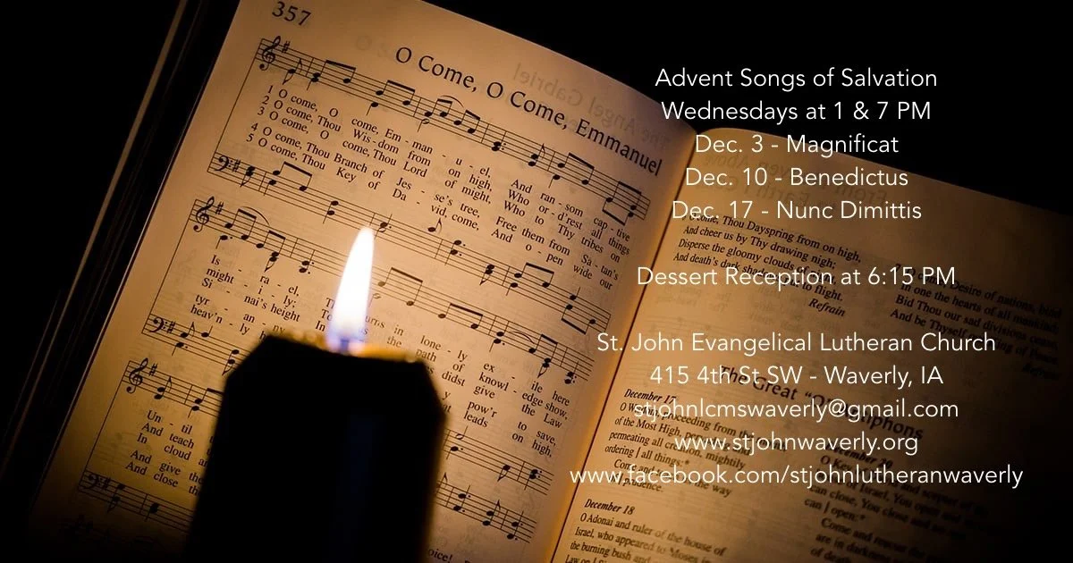 This year’s Advent Midweek Service theme will be “Advent Songs of Salvation.” The Church sings with Mary (The Magnificat), Zechariah (The Benedictus), and Simeon (The Nunc Dimittis) in anticipation and fulfillment of Christ’s coming. Services will be prayed on Wednesdays at 1:00 PM (Divine Service) and 7:00 PM (Evening Prayer) on December 3, 10, and 17. A dessert fellowship will be held each Wednesday from 6:15-6:45 PM, hosted by the Christian Life Board.